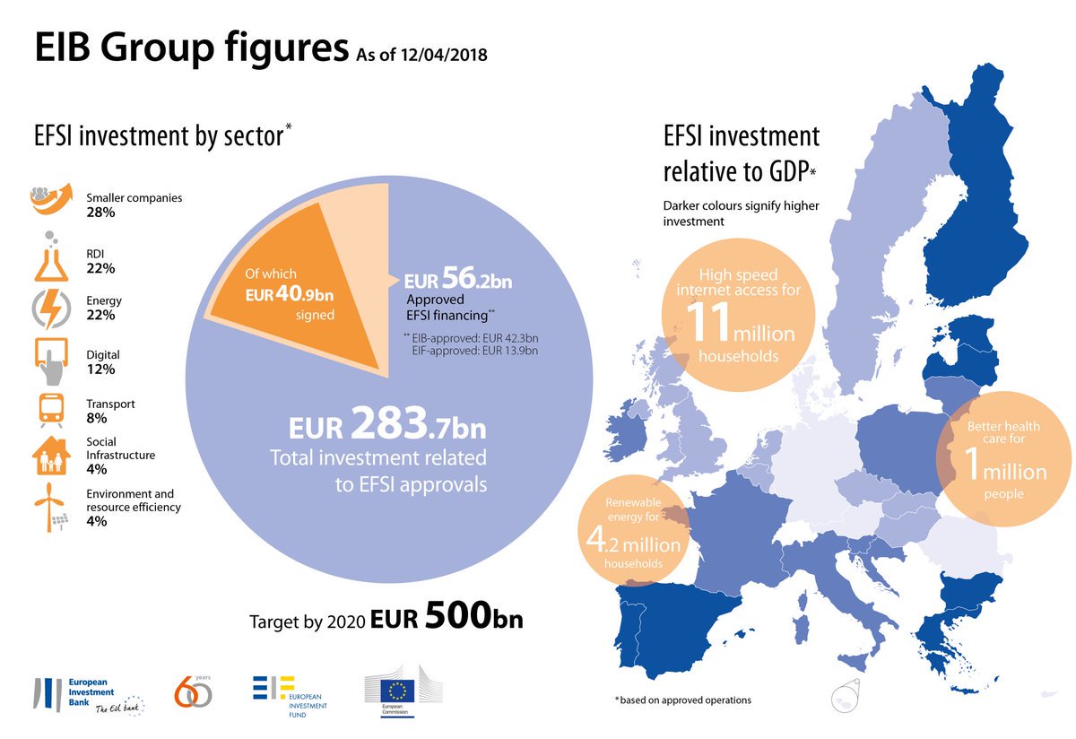 Ειδικότερα, σύμφωνα με τα στοιχεία της Επιτροπής, η συνολική χρηματοδότηση από το Ευρωπαϊκό Ταμείο Στρατηγικών Επενδύσεων (EFSI) στην Ελλάδα ανέρχεται σε 2,5 δισ. ευρώ και προβλέπεται να προκαλέσει πρόσθετες επενδύσεις ύψους 9,2 δισ. ευρώ.