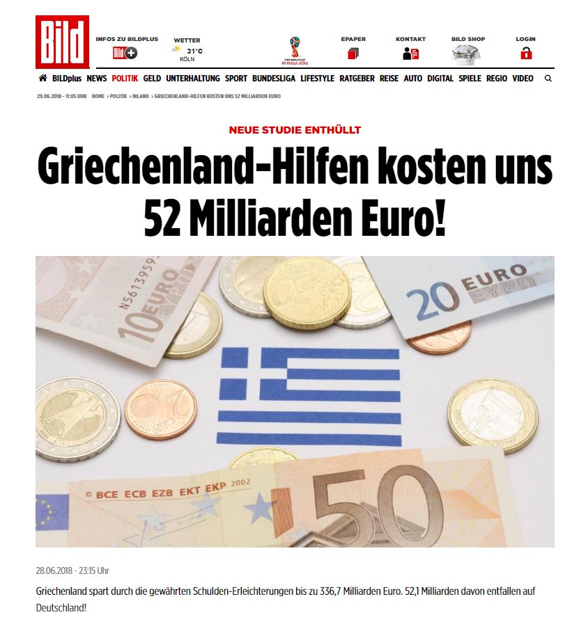 Μόνον οι τελευταίες συμφωνηθείσες ελαφρύνσεις του ελληνικού χρέους από το Εurogroup ανέρχονται σε 47,9 δισ. ευρώ", όπως γράφει η Bild.
