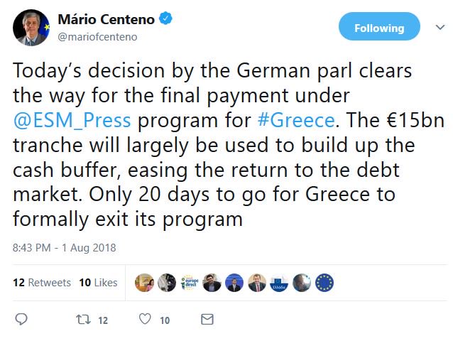 Τη σημερινή έγκριση της Bundestag να δώσει το πράσινο φως για την εκταμίευση της τελευταίας δόσης του τρίτου προγράμματος προς την Ελλάδα χαιρέτισε με ανάρτησή του στο Twitter ο υπουργός Οικονομικών της Πορτογαλίας και πρόεδρος του Eurogroup M. Centeno.