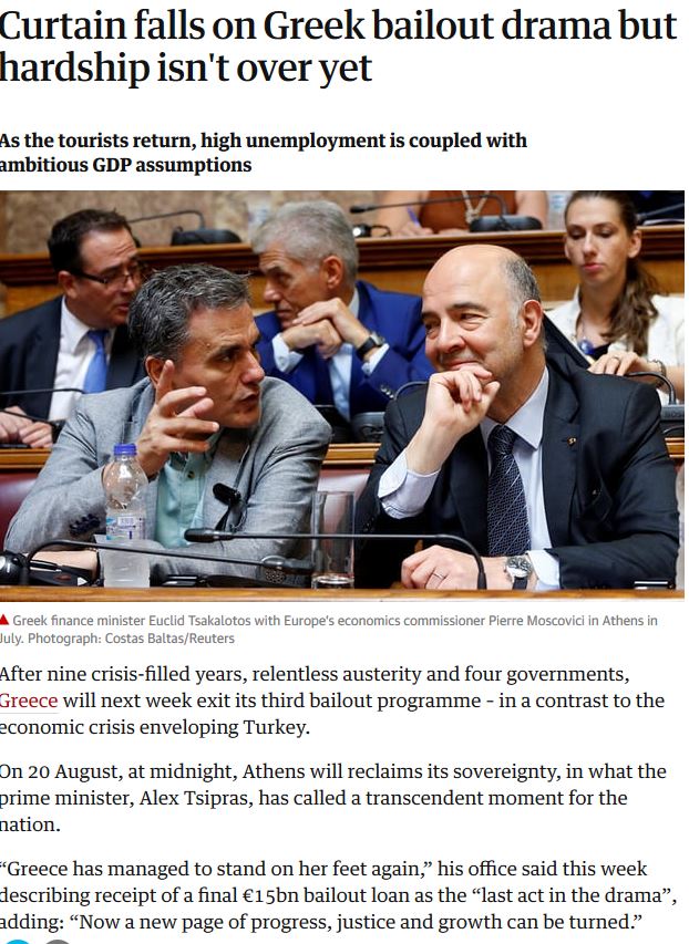 Μετά από εννέα χρόνια βαθιάς κρίση, αμείλικτη λιτότητα και τέσσερις κυβερνήσεις, η Ελλάδα θα ολοκληρώσει την επόμενη εβδομάδα, το τρίτο της πρόγραμμα διάσωσης - σε αντίθεση με την οικονομική κρίση που εξελίσσεται στην Τουρκία, αναφέρει σε σημερινό (12/8/2018) δημοσίευμα η βρετανική εφημερίδα Guardian.