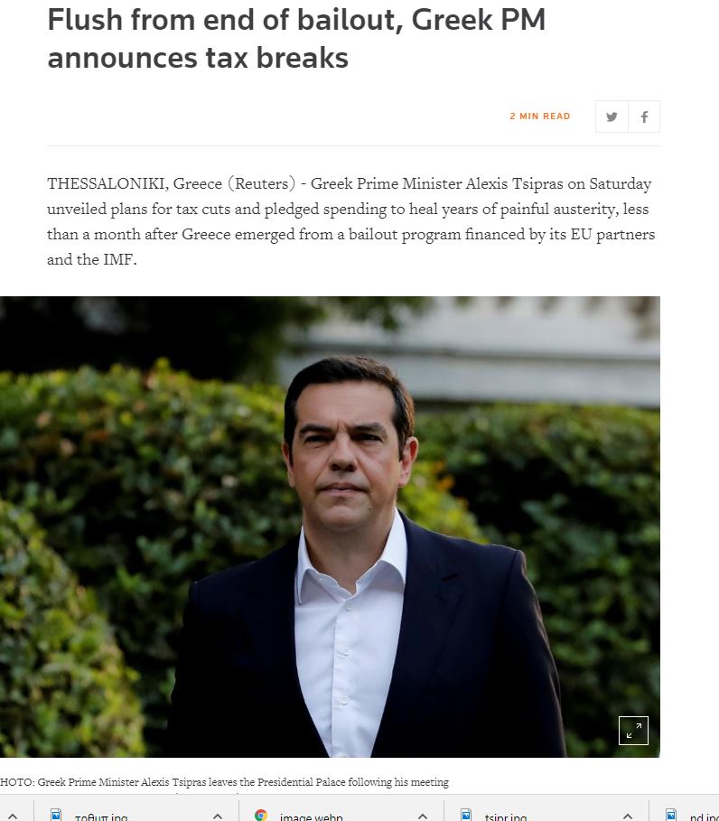 Τα σχέδια του για φορολογικές ελαφρύνσεις και αύξηση των δαπανών για να «θεραπεύσει» οκτώ χρόνια οδυνηρής λιτότητας, λιγότερο από ένα μήνα από το τέλος των προγραμμάτων διάσωσης παρουσίασε ο πρωθυπουργός, σημειώνει το Reuters, αναφορικά με τις εξαγγελίες Τσίπρα στη ΔΕΘ.