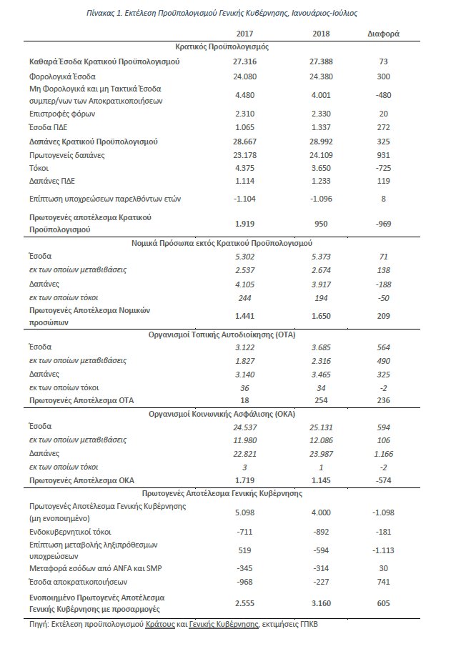 Τέλος, η μείωση των ληξιπρόθεσμων υποχρεώσεων της Γενικής Κυβέρνησης κατά 594 εκατ. το επτάμηνο του 2018 έναντι αύξησης κατά 519 εκατ. ευρώ την αντίστοιχη περίοδο πέρυσι είχε σημαντική επίπτωση (1.113 εκατ. ευρώ) στην αύξηση του πρωτογενούς πλεονάσματος της Γενικής Κυβέρνησης το 2018.