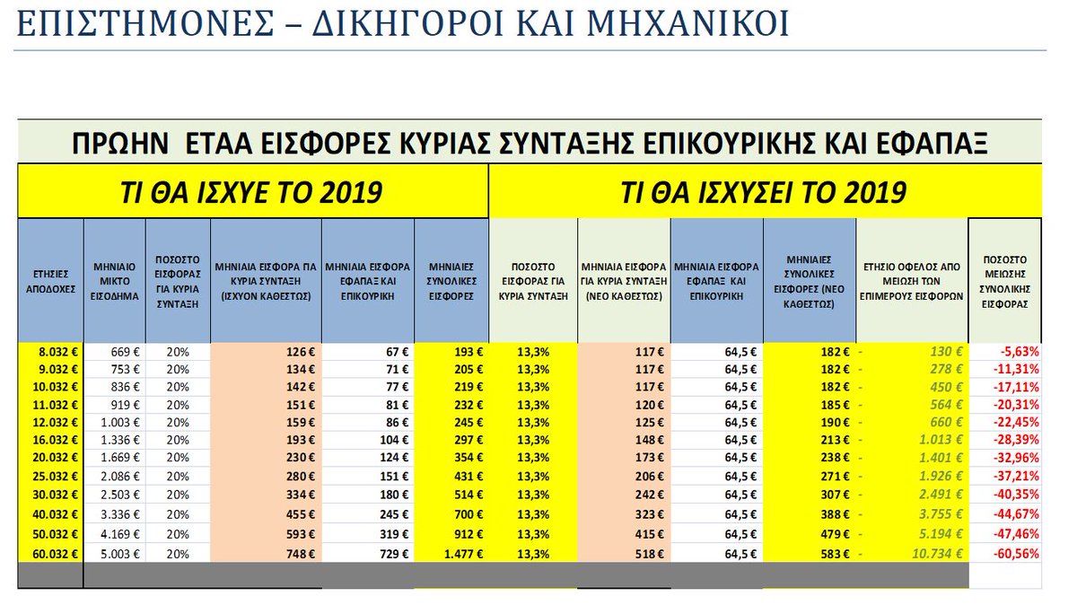 - Επιπλέον, για τους αυτοαπασχολούμενους επιστήμονες μηχανικούς, δικηγόρους και γιατρούς, το ασφάλιστρο για επικουρική σύνταξη και εφάπαξ θα υπολογίζεται στην ελάχιστη βάση υπολογισμού. Αυτό σημαίνει ότι, ανεξαρτήτως εισοδήματος, η εισφορά δεν θα ξεπερνά το ελάχιστο που ισχύει σήμερα των 64,5 ευρώ/μήνα».