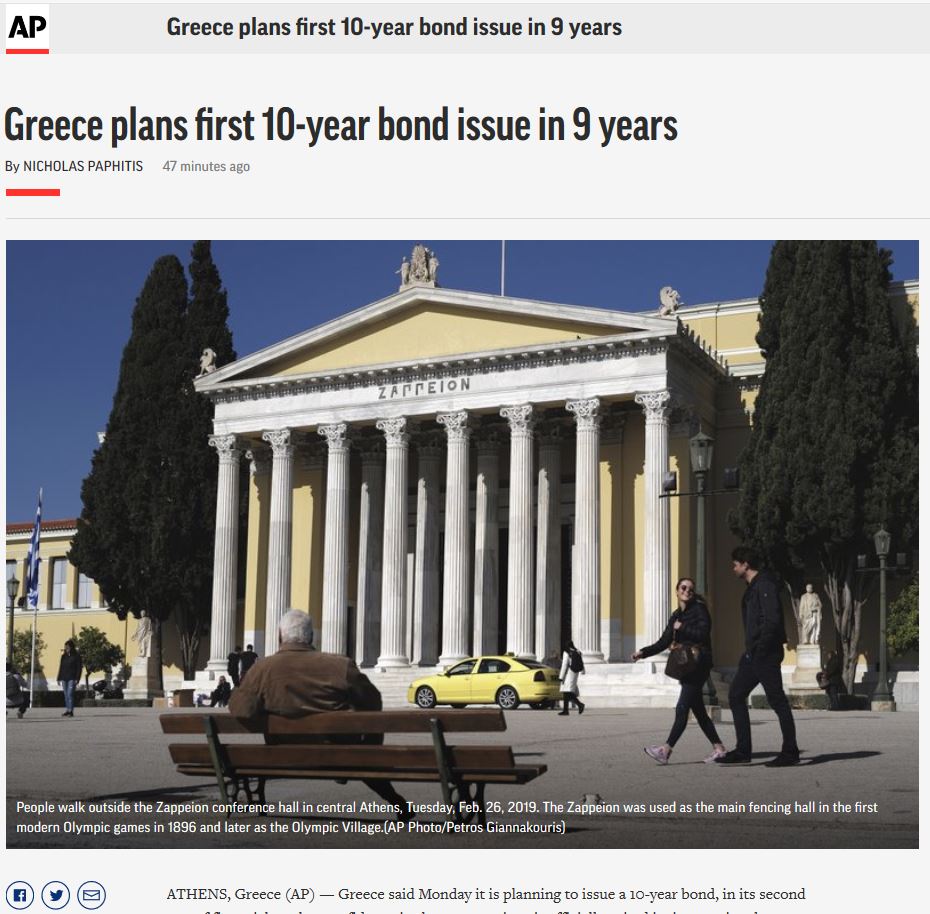 Σύμφωνα με το Associated Press το timing είναι καλό για την άντληση χρημάτων, καθώς η απόδοση του 10ετούς ελληνικού ομολόγου ήταν στο 3,6% σήμερα (4/3/2019), που είναι το χαμηλότερο μιας 10ετίας.