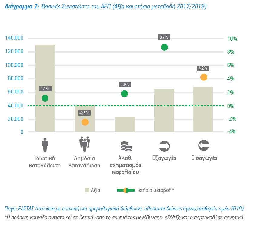 "Το γεγονός πάντως ότι η κάμψη εντός του 2018 οφείλεται αποκλειστικά στις δύο κατηγορίες "Άλλες Κατασκευές" (κυρίως πρόγραμμα δημοσίων επενδύσεων) και "Μεταφορικός εξοπλισμός και οπλικά συστήματα" (κυρίως εισαγωγές πλοίων) αφήνουν περιθώρια αισιοδοξίας για ανάκαμψη του ακαθάριστου σχηματισμού παγίου κεφαλαίου εντός του 2019", αναφέρεται.