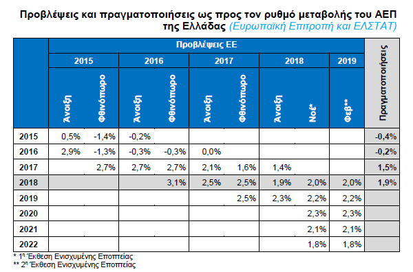 Την ίδια ώρα, το ΔΝΤ στην έκθεσή του για τις Παγκόσμιες Οικονομικές Προβλέψεις το 2019, εκτιμά χαμηλότερο ρυθμό ανάπτυξης στην Ευρωζώνη το 2019 σε σύγκριση με τις προηγούμενες προβλέψεις του (+1,3% έναντι πρόβλεψης +1,9% στις προβλέψεις του Ιανουαρίου 2019).
