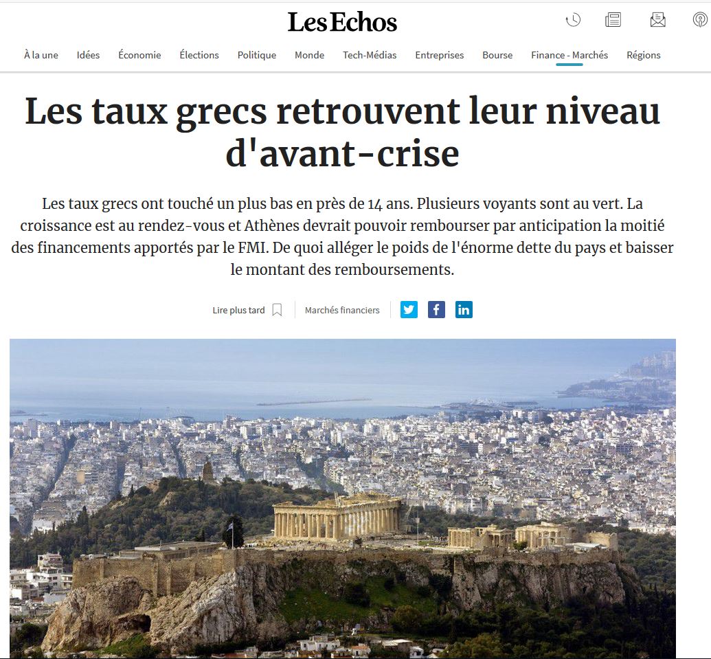 Η γαλλική οικονομική εφημερίδα γράφει ότι «το πιο εντυπωσιακό είναι ότι τα πενταετή ελληνικά ομόλογα παρουσίασαν απόδοση 2,13% ή 26 μονάδες βάσης χαμηλότερα από τα αμερικανικά κρατικά ομόλογα παρόμοιας διάρκειας. Και αυτό, ενώ η Ελλάδα παρέμενε λιγότερο από ένα χρόνο πριν υπό τον έλεγχο του ΔΝΤ και του Ευρωπαϊκού Μηχανισμού Σταθερότητας.