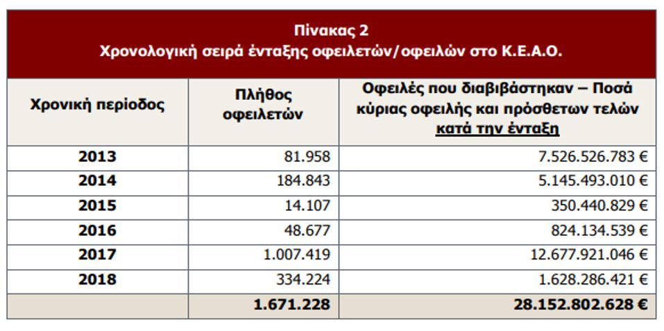 Από τα 34.786.880.209 ευρώ που είναι το τρέχον υπόλοιπο οφειλών, τα 16.771.360.186 ευρώ, δηλαδή το 48,21%, είναι οφειλές που δημιουργήθηκαν πριν από το 2009 το οποίο σημαίνει ότι μέσα μόνο σε 10 χρόνια της περιόδου της κρίσης σχηματίστηκαν αλλά 18 δις περίπου νέες οφειλές.