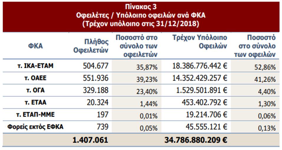 Το 82,20% των οφειλετών (1.156.696 οφειλέτες) έχουν οφειλή έως 30.000 ευρώ ο καθένας ενώ από 1.000.000 κα πάνω οφείλουν 1806 ασφαλισμένοι οι οποίοι μοιράζονται και τη μερίδα του λέοντος των ληξιπρόθεσμων ύψους περίπου 4 δισεκ.(4.105.897.418€).