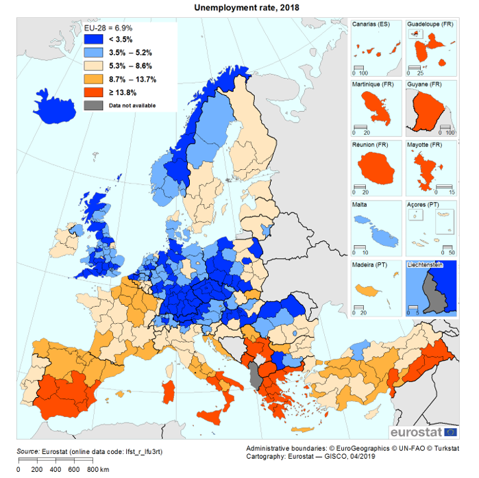 Μεταξύ των 280 περιφερειών της ΕΕ για τις οποίες υπάρχουν διαθέσιμα στοιχεία, σε 71 το ποσοστό ανεργίας ήταν μικρότερο από 3,5% το 2018, το ήμισυ του μέσου όρου της ΕΕ (6,9%).