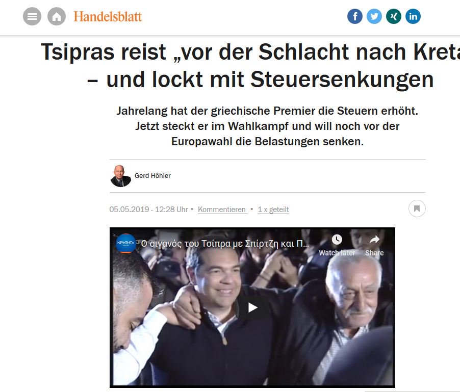 Στις Ευρωεκλογές της 26ης Μαΐου κρίνονται για τον Έλληνα πρωθυπουργό Αλέξη Τσίπρα, πολλά περισσότερα από 21 έδρες στο Ευρωκοινοβούλιο, επισημαίνει σε δημοσίευμά της η γερμανική εφημερίδα Handelsblatt για τις προεκλογικές παροχές της κυβέρνησης ΣΥΡΙΖΑ.