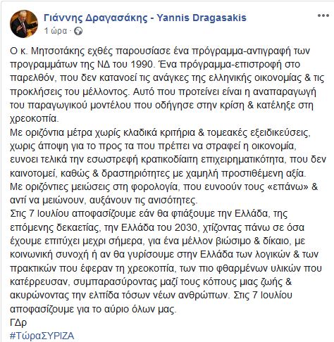 Επικριτικά σχόλια για το πρόγραμμα του Κυριάκου Μητσοτάκη διατυπώνει ο αντιπρόεδρος της κυβέρνησης και υπουργός Οικονομίας, Γιάννης Δραγασάκης με ανάρτησή του στα μέσα κοινωνικής δικτύωσης.