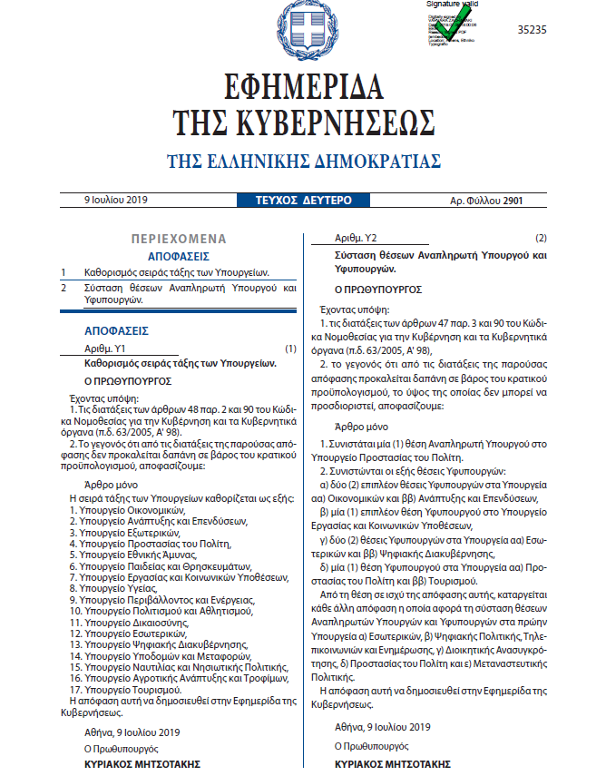 Με απόφαση του πρωθυπουργού Κυριάκου Μητσοτάκη καθορίστηκε σήμερα η σειρά τάξης των υπουργείων.