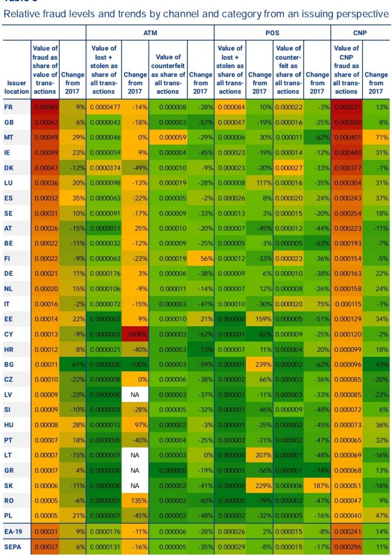 Αναλυτικότερα, όπως προκύπτει από την 6η Έκθεση της Ευρωπαϊκής Κεντρικής Τράπεζας, που αναλύει τις πληρωμές με κάρτες στον Ενιαίο Χώρο Πληρωμών σε Ευρώ (SEPA), ο οποίος αποτελείται από το σύνολο της Ευρωπαϊκής Ένωσης, καθώς και στην Ισλανδία, στο Λιχτενστάιν, στο Μονακό, στη Νορβηγία και στην Ελβετία, η αξία των παράνομων συναλλαγών αυξήθηκε το 2018 στην Ελλάδα κατά 4% σε ετήσια βάση.