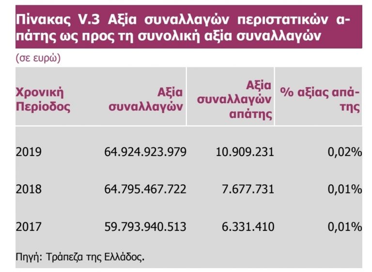 «Το 2018, το 96% των έκνομων συναλλαγών με κάρτες αφορούσε σε πληρωμές μέσω διαδικτύου, ηλεκτρονικού ταχυδρομείου ή τηλεφώνου, το 3% σε συναλλαγές από ATMs και μόλις το 1% σε πληρωμές σε POS», επισημαίνεται χαρακτηριστικά.