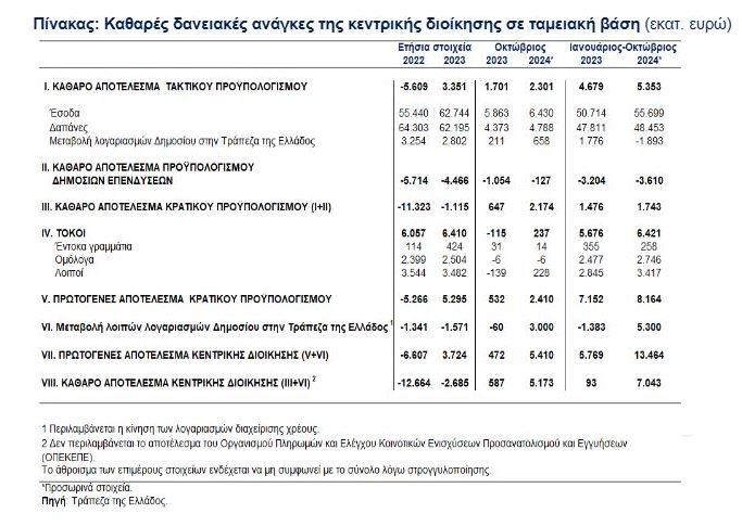 Εκτόξευση στο πρωτογενές πλεόνασμα του προϋπολογισμού καταγράφηκε την περίοδο Ιανουαρίου-Οκτωβρίου 2024, με το ποσό να ανέρχεται σε 7.043 εκατ. ευρώ έναντι πλεονάσματος 93 εκατ. ευρώ την αντίστοιχη περίοδο του 2023, αναφέρει η Τράπεζα της Ελλάδος (ΤτΕ).