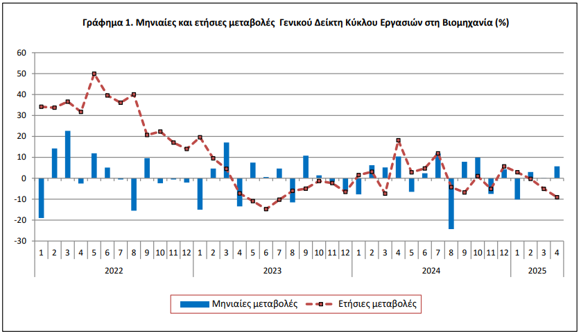 Ο Γενικός Δείκτης Κύκλου Εργασιών στη Βιομηχανία (σύνολο εγχώριας και εξωτερικής αγοράς) του μηνός Απριλίου 2025, σε σύγκριση με τον αντίστοιχο δείκτη του Απριλίου 2024, παρουσίασε μείωση 9,1% έναντι αύξησης 18,2% που σημειώθηκε κατά την αντίστοιχη σύγκριση του έτους 2024 με το 2023.