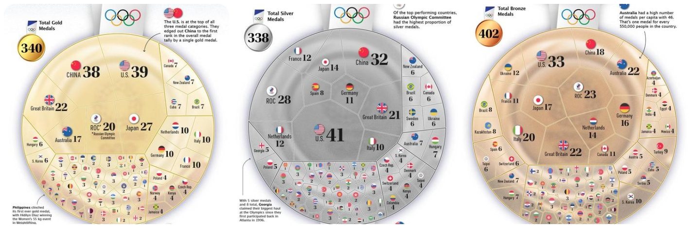 Πιο αναλυτικά, οι Αμερικάνοι κυριάρχησαν στα «χρυσά» των Κινέζων με μόνο ένα μετάλλιο διαφορά, 39 και 38 αντίστοιχα. Ακριβώς από κάτω του ήταν οι Ιάπωνες με 27 κατακτήσεις.