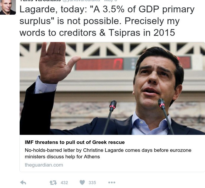 «Lagarde, σήμερα: «Ένα πλεόνασμα 3,5% του ΑΕΠ είναι απίθανο». Ακριβώς τα λόγια μου στους δανειστές και στον Τσίπρα το 2015».