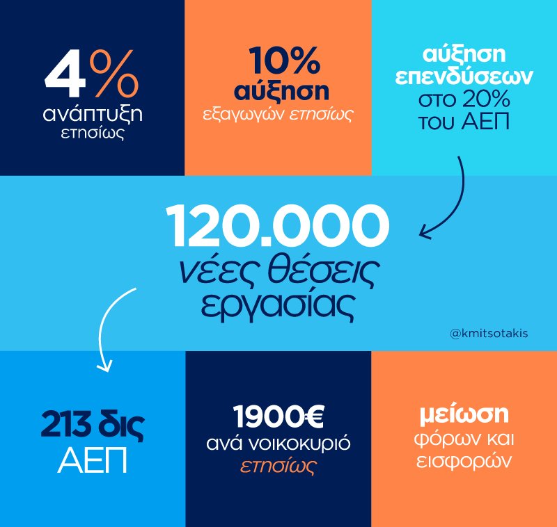 Ακόμη, ο πρόεδρος της Ν.Δ. τονίζει ότι με τη σωστή διαχείριση οι επενδύσεις μπορούν να εκτοξευτούν στο 20% του ΑΕΠ, το οποίο με τη σειρά του μπορεί να οδηγήσει στη δημιουργία 120.000 νέων θέσεων εργασίας, ανεβάζοντας το ΑΕΠ της χώρας στα 213 δισ. ευρώ.