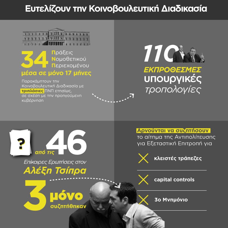 Επιπλέον, ο Αρχηγός της Αξιωματικής Αντιπολίτευσης επισημαίνει την επιλεκτική προτεραιότητα στα αιτήματα Κοινοβουλευτικών Ομάδων για τη σύσταση Εξεταστικών Επιτροπών, καθώς και την συστηματική υποβάθμιση του Κοινοβουλευτικού ελέγχου, με ευθύνη Υπουργών, που αρνούνται να προσέλθουν στη Βουλή.