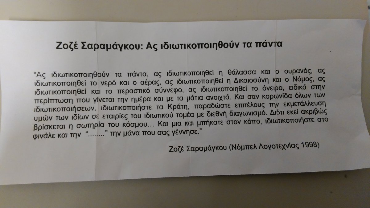 Ειδικότερα, τα στελέχη του κόμματος κ.κ. Πετράκος και Λεουτσάκος, πέταξαν από τα άνω θεωρία της Βουλής ένα φέιγ βολάν με ένα απόσπασμα από έργο του γνωστού νομπελίστα συγγραφέα, Ζοζέ Σαραμάγκου, σχετικά με τις ιδιωτικοποιήσεις.