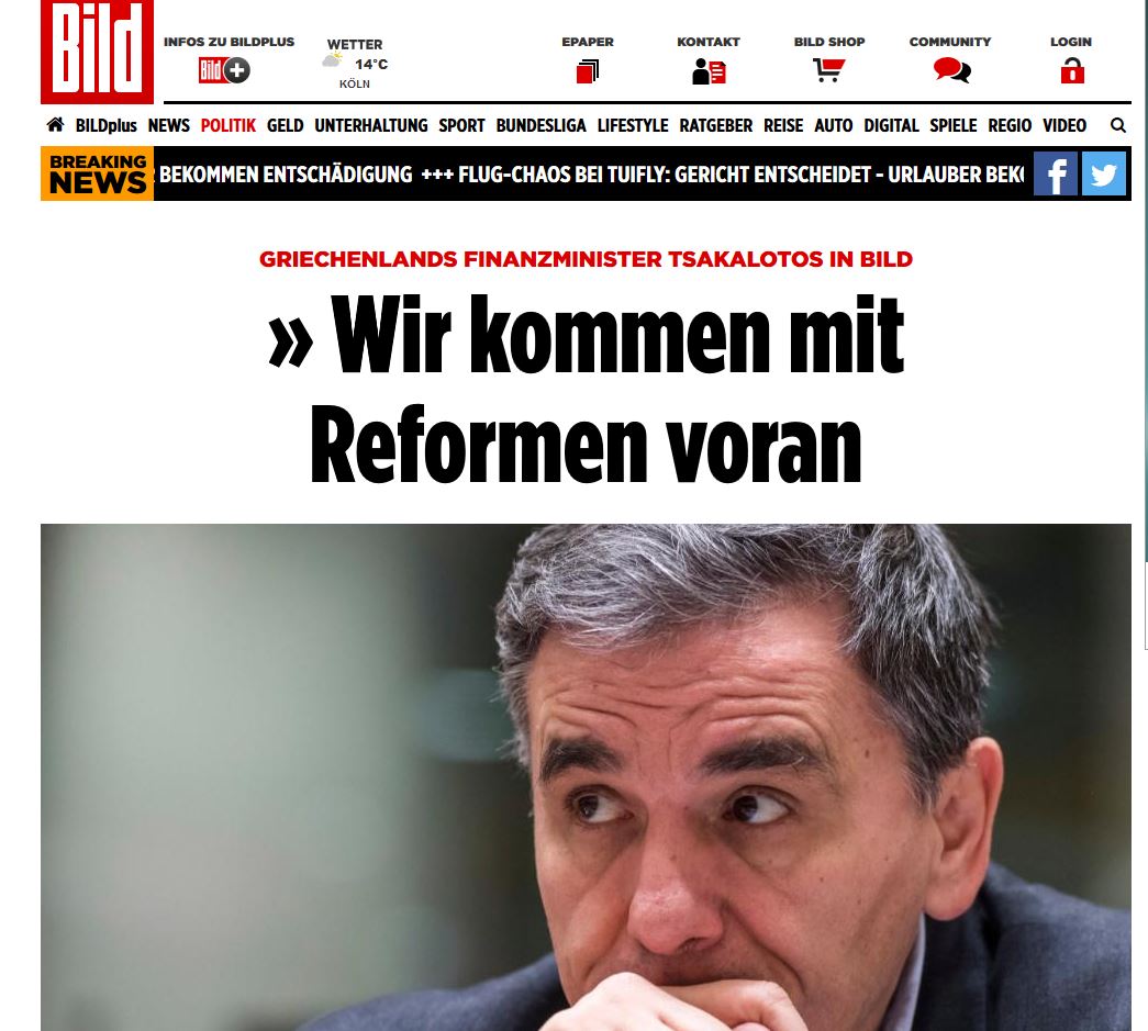 Την θέση ότι το ΔΝΤ θα πρέπει να σταματήσει να έχει παράλογες απαιτήσεις από την Ελλάδα, ιδιαίτερα τη στιγμή που αυτή είναι έτοιμη να γυρίσει σελίδα διατυπώνει μιλώντας στη γερμανική εφημερίδα Bild ο υπ. Οικονομικών Ευκλείδης Τσακαλώτος.