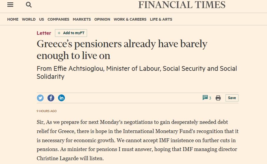 Το να επιμένει για περαιτέρω μείωση των συντάξεων ενώ οι Έλληνες συνταξιούχοι επιβιώνουν οριακά σίγουρα δεν αποτελεί έναν τρόπο αντιμετώπισης της δυσαρέσκειας των πολιτών» καταλήγει στο άρθρο της η υπουργός Εργασίας.