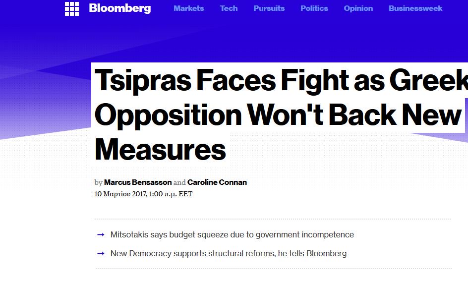 Την θέση ότι η κυβέρνηση Τσίπρα δεν θα πρέπει να υπολογίζει στη στήριξη της ΝΔ για την ψήφιση των νέων μέτρων, διότι αυτά, όπως είπε, είναι υπερβολικά και επιβλήθηκαν εξαιτίας της ανικανότητας του Έλληνα πρωθυπουργού διατύπωσε ο πρόεδρος της ΝΔ, Κ. Μητσοτάκης σε τηλεοπτική συνέντευξη του στο Bloomberg.