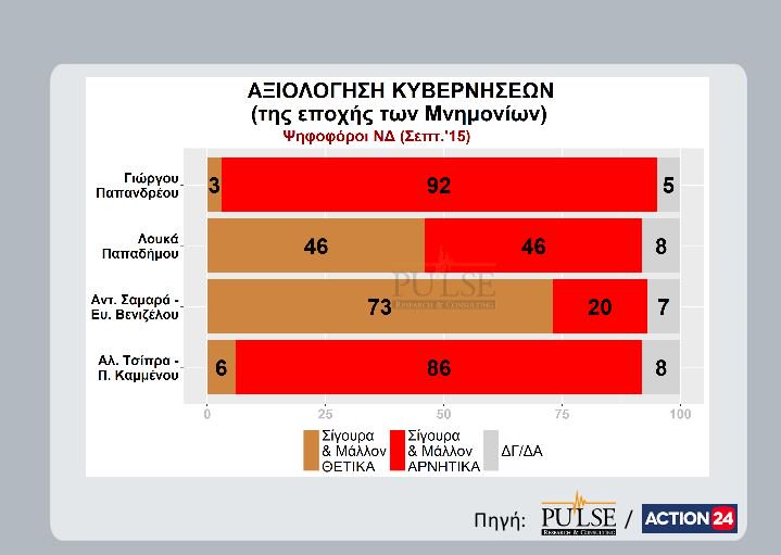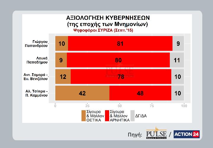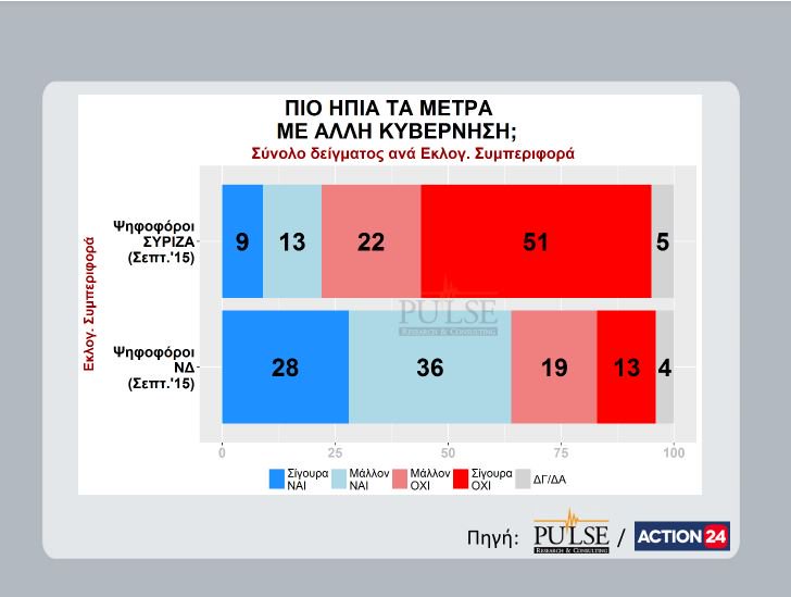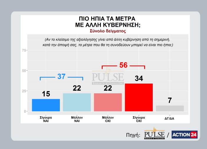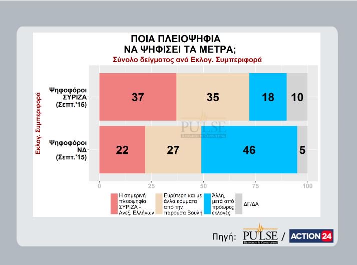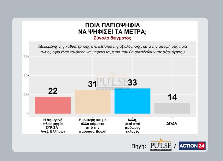 Στο ερώτημα ποια κοινοβουλευτική πλειοψηφία θέλουν οι πολίτες να ψηφίσει τα μέτρα για το κλείσιμο της αξιολόγησης, μόνο το 22% των ερωτηθέντων απαντούν η σημερινή πλειοψηφία ΣΥΡΙΖΑ-ΑΝΕΛ. Το 33% των ερωτηθέντων προτιμούν άλλη πλειοψηφία που θα προκύψει μετά από πρόωρες εκλογές ενώ το 31% προτιμούν ευρύτερη πλειοψηφία από την παρούσα Βουλή.