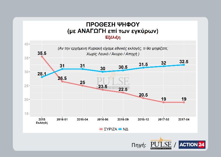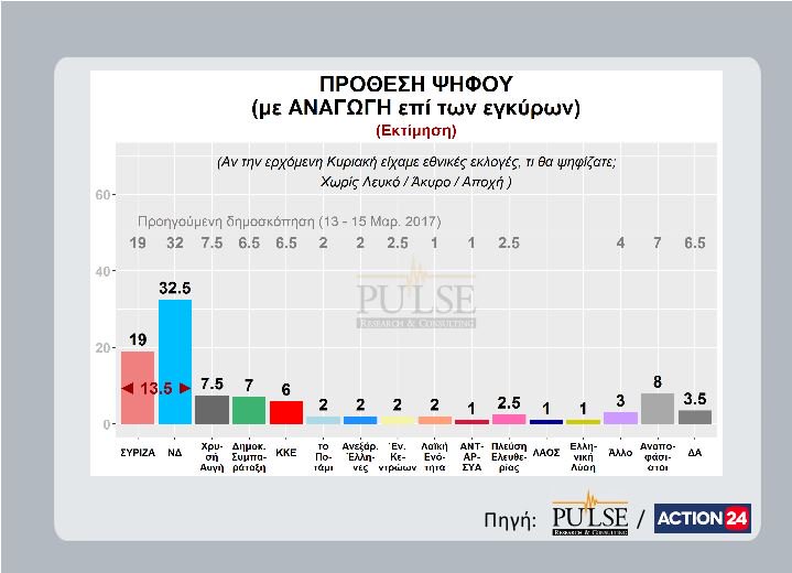 Ειδικότερα, το κόμμα του Κυριάκου Μητσοτάκη βρίσκεται πρώτο στην πρόθεση ψήφου με 32,5%, έναντι 19% του κυβερνόντος κόμματος, ενώ τρίτη έρχεται η Χρυσή Αυγή με 7,5%.