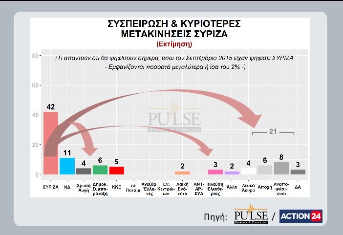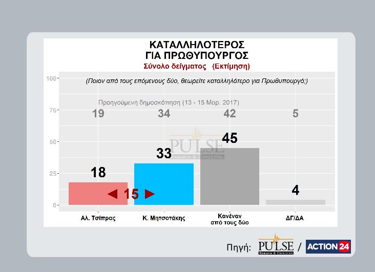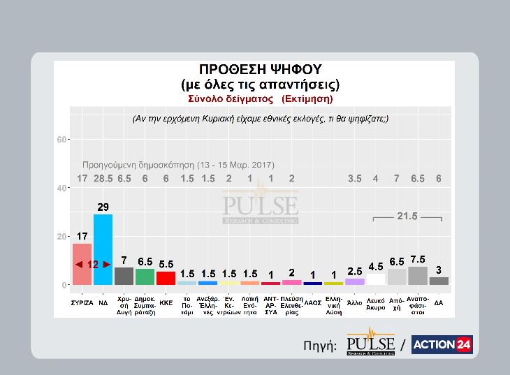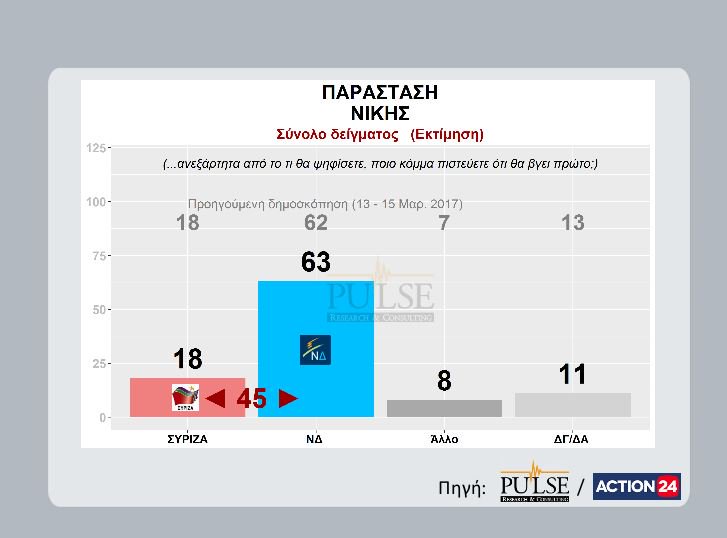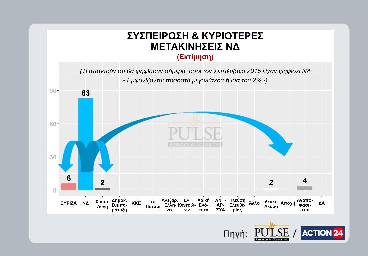 Ισχυρό προβάδισμα 13,5 ποσοστιαίων μονάδων επί του ΣΥΡΙΖΑ απολαμβάνει η Νέα Δημοκρατία στη νέα δημοσκόπηση Pulse που έγινε για λογαριασμό του Action24 και την εκπομπή Evening Report.