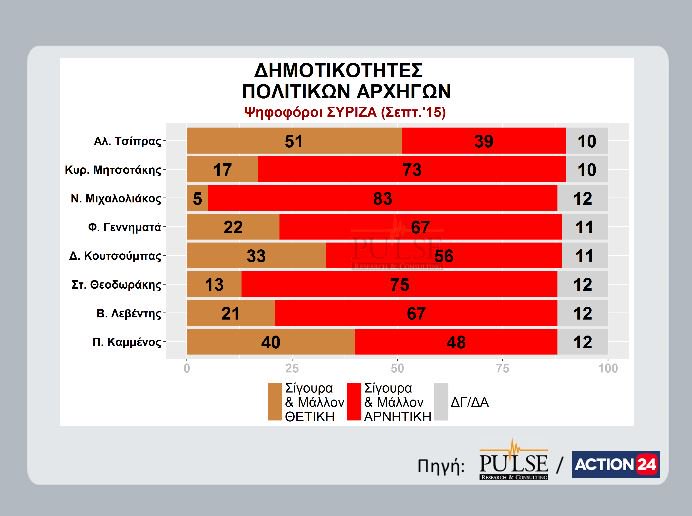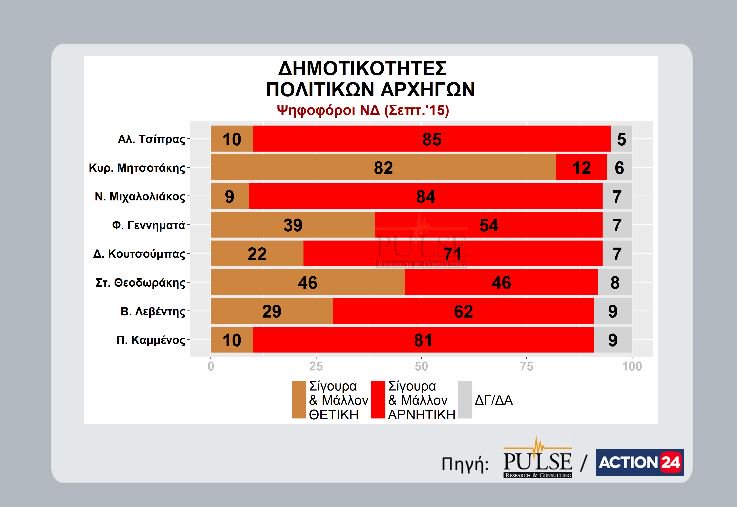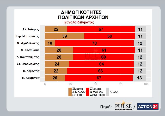 Πιο δημοφιλής πολιτικός αρχηγός εμφανίζεται ο Κυριάκος Μητσοτάκης με 39% σίγουρα-μάλλον θετικές απόψεις, ενώ ο Αλέξης Τσίπρας έχει 22% στην ίδια κατηγορία.