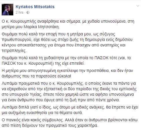 Λυπάμαι πραγματικά που ο κ. Κουρουμπλής, ο οποίος έκανε τα πάντα για να εξαιρεθούν από την εξεταστική οι δύο περίοδοι της δικιάς του εμπλοκής στο υπουργείο Υγείας, έπεσε τόσο χαμηλά ώστε να αφήσει υπονοούμενα για έναν άνθρωπο που έφυγε από τη ζωή πριν από πέντε χρόνια», αναφέρει ο πρόεδρος της Νέας Δημοκρατίας, Κυριάκος Μητσοτάκης, καταλήγοντας: