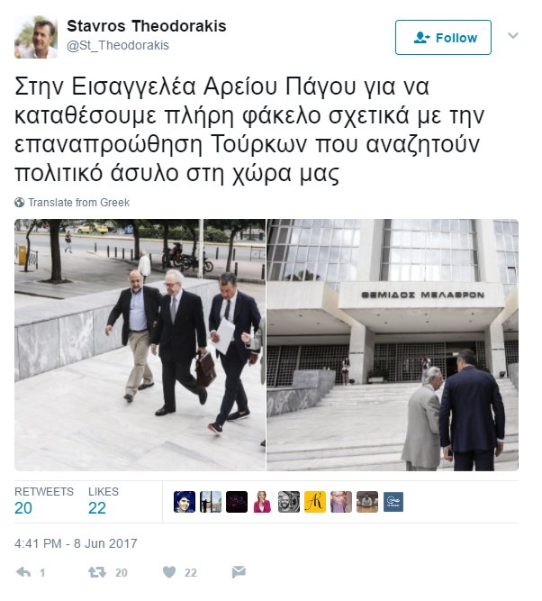 Στην Εισαγγελέα Αρείου Πάγου μετέβη σήμερα (8 Ιουνίου 2017) ο επικεφαλής του Ποταμιού, κ. Σταύρος Θεοδωράκης, για να καταθέσει πλήρη φάκελο σχετικά με την επαναπροώθηση Τούρκων που αναζητούν πολιτικό άσυλο στη χώρα μας, όπως γνωστοποίησε ο ίδιος στο Facebook.