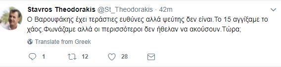 Όπως αναφέρει ο επικεφαλής του Ποταμιού «ο Βαρουφάκης έχει τεράστιες ευθύνες αλλά ψεύτης δεν είναι. Το 15 αγγίξαμε το χάος. Φωνάζαμε αλλά οι περισσότεροι δεν ήθελαν να ακούσουν. Τώρα;