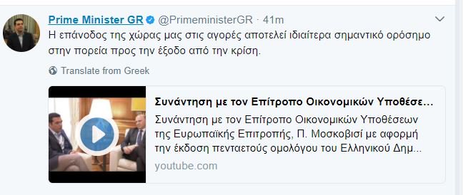 Την επιστροφή της Ελλάδας στις αγορές σχολιάζει μέσω του twitter με αφορμή τη συνάντηση που είχε με τον Επίτροπο Οικονομικών Υποθέσεων, Pierre Moscovici.