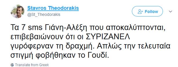 Την ανταλλαγή γραπτών μηνυμάτων μεταξύ του πρωθυπουργού και του πρώην υπουργού Οικονομικών, Γιάνη Βαρουφάκη, αλλά και τα σχέδια περί Grexit σύμφωνα με δημοσιεύματα του Τύπου σχολιάζει με ανάρτησή του στο Twitter ο επικεφαλής του Ποταμιού, Σταύρος Θεοδωράκης.