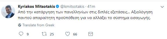 Κριτική στην κυβέρνηση για το θέμα των εξετάσεων και τάσσεται και υπέρ της αξιολόγησης, ασκεί ο Κυριάκος Μητσοτάκης, σχολιάζοντας μέσω Twitter τις τελευταίες εξελίξεις στο χώρο της Παιδείας και τις ανακοινώσεις του κ. Γαβρόγλου.
