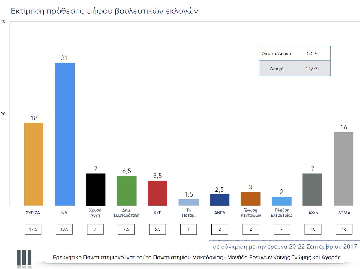 Προβάδισμα 13% έχει η Νέα Δημοκρατία έναντι του ΣΥΡΙΖΑ σε νέα δημοσκόπηση του Πανεπιστημίου Μακεδονίας.