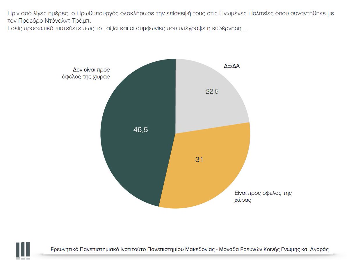 Σε σχέση με την επίσκεψη του πρωθυπουργού στις ΗΠΑ, τη συνάντηση με τον πρόεδρο Trump και τις συμφωνίες που υπογράφηκαν η πλειονότητα των ερωτηθέντων (46,5%) δηλώνει ότι η επίσκεψη δεν απέβη προς όφελος της χώρας, 31% θεωρεί ότι είναι ωφέλιμη για τη χώρα ενώ 22,5% δηλώνει δεν ξέρω/δεν απαντώ.