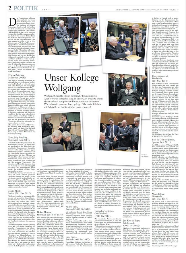 O Ευάγγελος Βενιζέλος συμμετείχε σε αφιέρωμα της εφημερίδας Frankfurter Allgemeine Sonntagszeitung (29.10.2017) στο οποίο διατελέσαντες υπουργοί οικονομικών από διάφορες χώρες αναφέρθηκαν στην εμπειρία της συνεργασίας τους με τον W. Scaheuble.