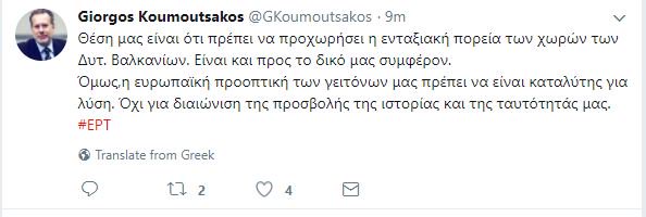 Όμως, η ευρωπαϊκή προοπτική των γειτόνων μας πρέπει να είναι καταλύτης για λύση. Όχι για διαιώνιση της προσβολής της ιστορίας και της ταυτότητάς μας».