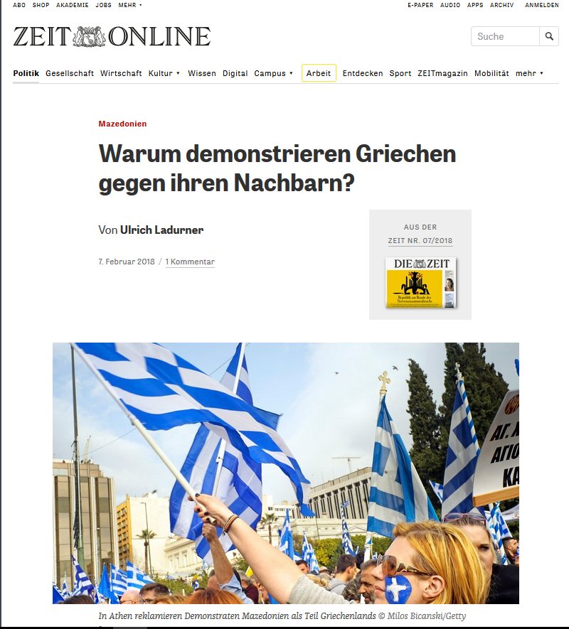 Η εβδομαδιαία εφημερίδα Die Zeit προσπαθεί να απαντήσει στο ερώτημα «γιατί οι Έλληνες διαδηλώνουν εναντίον του γείτονα».