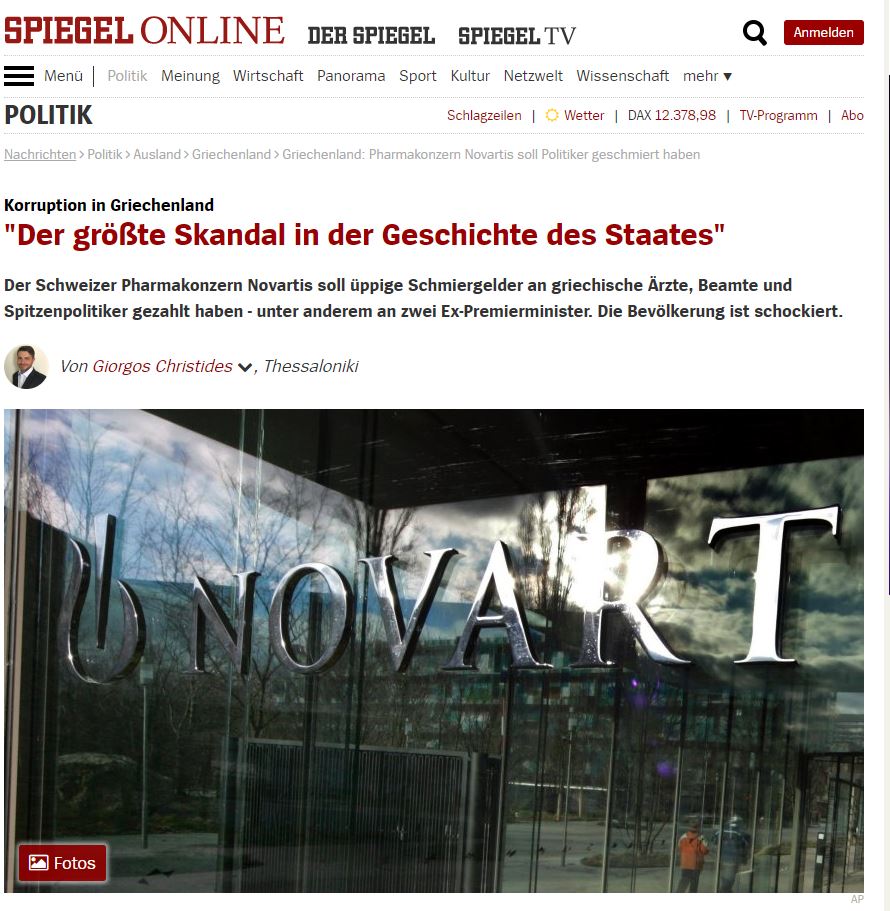 Ως «το μεγαλύτερο σκάνδαλο στην ιστορία του ελληνικού κράτους» χαρακτηρίζει το γερμανικό περιοδικό Der Spiegel την υπόθεση Novartis, επισημαίνοντας ότι η ελβετική φαρμακοβιομηχανία φέρεται να δωροδόκησε με μεγάλα ποσά Έλληνες γιατρούς, δημόσιους υπαλλήλους, αλλά και υψηλόβαθμους πολιτικούς, μεταξύ των οποίων και δύο πρώην πρωθυπουργοί.