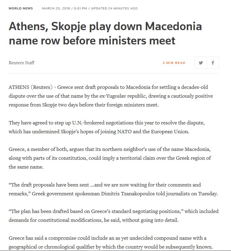 Σύμφωνα με το Reuters το προσχέδιο προτάσεων έχει λάβει θετική αντίδραση από τα Σκόπια.