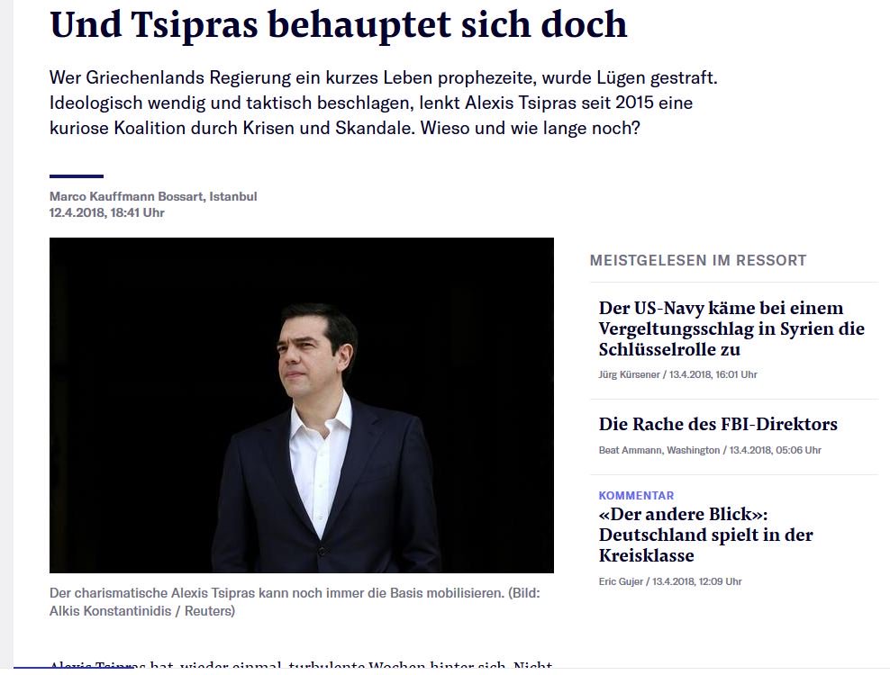 H εφημερίδα της Ζυρίχης, αφού αναφέρει το ονοματολογικό με την ΠΓΔΜ, την παραίτηση Αντωνοπούλου/Παπαδημητρίου, τη σύλληψη των Ελλήνων στρατιωτικών από τους Τούρκους και τη δύσκολη συνεννόηση των κ. Καμμένου και Κοτζιά στο θέμα αυτό, προσθέτει ότι «εν τούτοις σε σχέση με τις ρήξεις του πρώτου μισού της θητείας του (Τσίπρα), τα σημερινά προβλήματα ωχριούν».