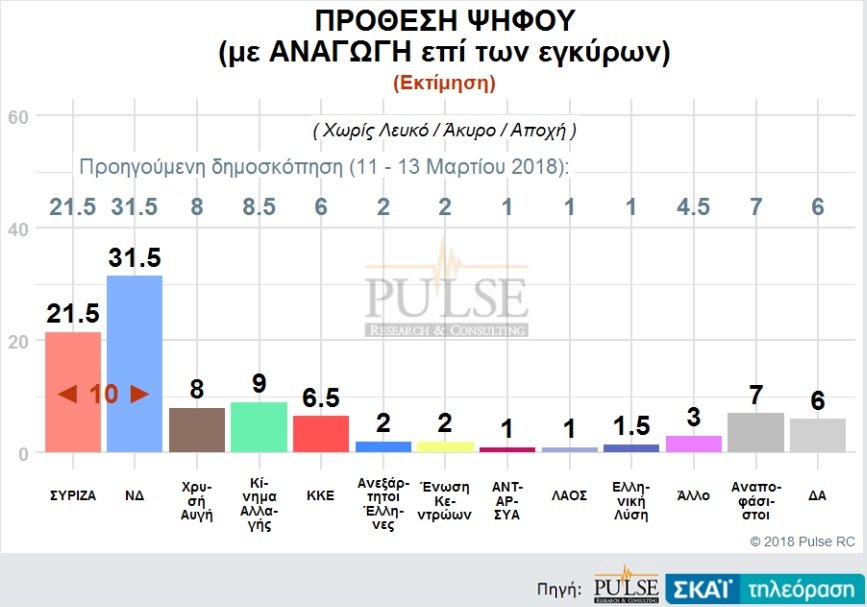 Δημοσκόπηση Pulse: Προηγείται με 10% η ΝΔ έναντι του ΣΥΡΙΖΑ - 31,5% με 21,5%
