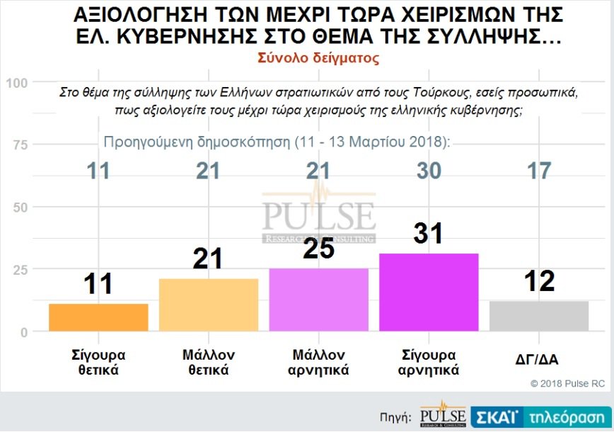 Σε ό,τι αφορά τους δύο ένστολους, το 56% κρίνει αρνητικά ή μάλλον αρνητικά τους έως τώρα χειρισμούς της Αθήνας, ποσοστό αυξημένο κατά πέντε μονάδες συγκριτικά με τον προηγούμενο μήνα.