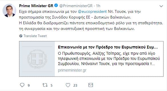 Όπως αναφέρεται στην ανακοίνωση που εξέδωσε το γραφείο Τύπου του πρωθυπουργού, ο κ. Τσίπρας είχε πριν από λίγο τηλεφωνική επικοινωνία με τον πρόεδρο του Ευρωπαϊκού Συμβουλίου, Donald Tusk, για την προετοιμασία της Συνόδου Κορυφής ΕΕ – Δυτικών Βαλκανίων στη Σόφια.
